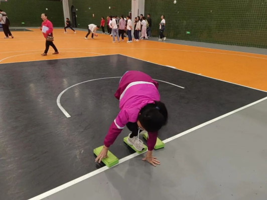 踏上“石子”,稳步前行。就如在教育的长河中跋涉般。“千淘万漉虽辛苦,吹尽狂沙始到金。”在赛场上,每一块“石子”的切换,都像是教职工们在育人之路上的一次耐心引导。他们谨慎地迈出每一步,眼神专注而坚定。一块又一块的“石子”的切换,正如一步又一步地循循善诱。他们在挑战中坚守,用团结的展现教育者的坚韧与执着。05