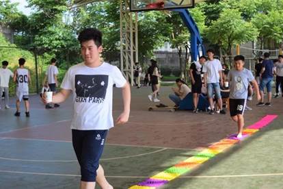 花样接力分为五个部分。五个部分分别为:原地大象鼻子转十圈;指压板上光脚跳绳,一次性10个;喝下一杯柠檬汁后摆出一个灿烂的微笑;运球跨全场上篮,一定要进球;抱着篮球大象鼻子15圈,然后将球投进篮筐。不得不说在指压板上跳绳和最后的十五圈转圈真的令人害怕呢,但每个队员都很好地完成了自己的任务,师生关系也变得越来越亲密。