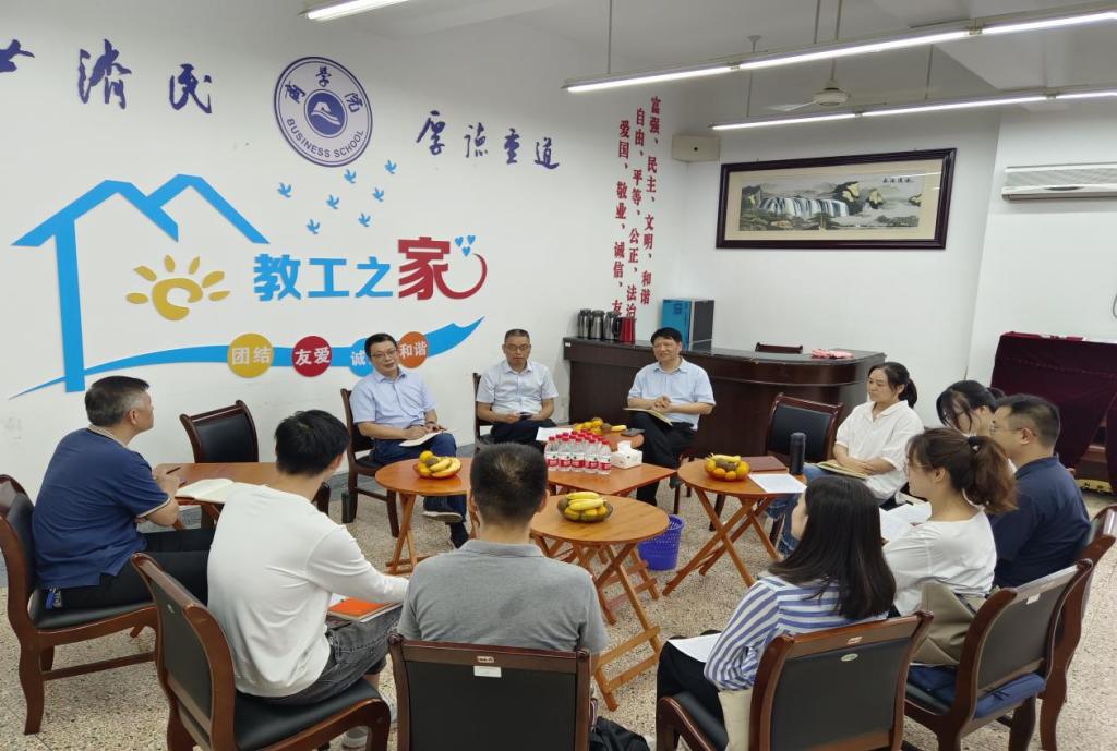 为更好服务新进教师,增强新进教师凝聚力和向心力,9月28日,商学院分工会以座谈会的形式,举办了一场“暖人心、知民意、懂民情、为民想”的微座谈。学院院长周鸿勇、党委书记陈伟鸿、办公室主任寿秀香、教研科科长许苗苗、分工会主席董德民、分工会组织委员葛天博及新入职教师参加了本次座谈会。座谈会由学院分工会主席董德民主持。
