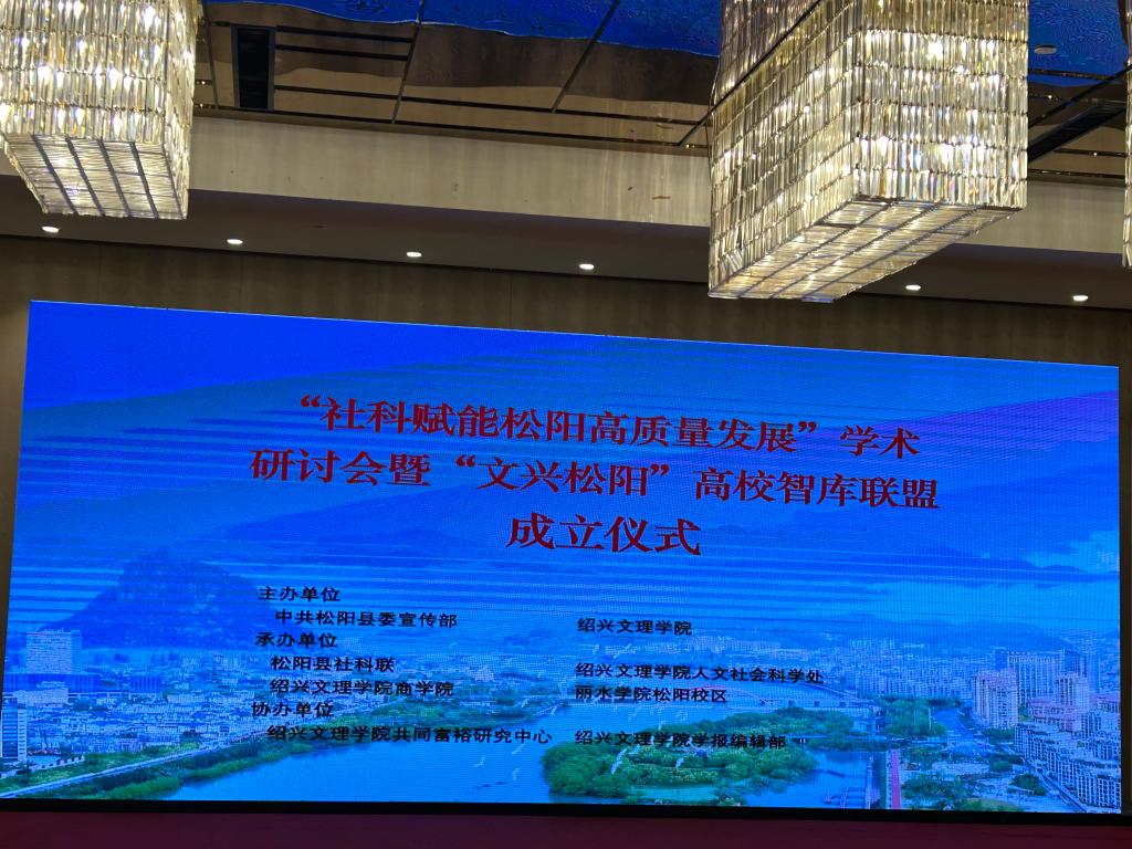 2023年6月14日上午,由绍兴文理学院与中共松阳县委宣传部主办的“社科赋能松阳高质量发展”学术研讨会暨“文兴松阳”高校智库联盟成立仪式在丽水市松阳县天元酒店举行。来自浙江大学、绍兴文理学院、中国(丽水)两山学院、丽水学院、松阳县委党校、松阳县博物馆等单位的近百人参会。绍兴文理学院校长赵阳,松阳县委常委、宣传部部长李巍出席开幕式并致辞。会议开幕式、学术研讨分别由绍兴文理学院社科处处长诸凤娟、商学院院长王华锋主持。