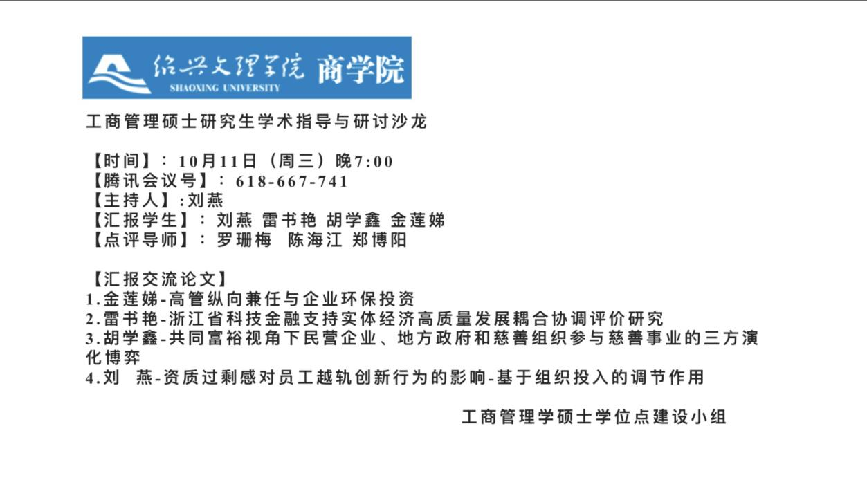 10月11日晚,为更好的引导、培养和提升工商管理硕士研究生科研水平,指导学生发表高质量论文,由工商管理学硕士学位点建设小组组织的新学期第一场学术指导与研讨沙龙,以线上直播的方式顺利举行。本次沙龙邀请了学院罗珊梅、陈海江和郑博阳3位硕士生导师作为点评嘉宾,4位22级工商管理学硕士研究生对自我投稿的论文进行了汇报,在校工商管理学硕20多位学生参与一起学习交流。