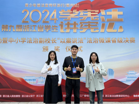 10月18日,第九届全省学生“学宪法 讲宪法”活动省级决赛在衢州举行。我院法学232班俞卿、祁煜参加比赛。经过激烈角逐,法学232班俞卿同学获得演讲比赛高校组一等奖。
