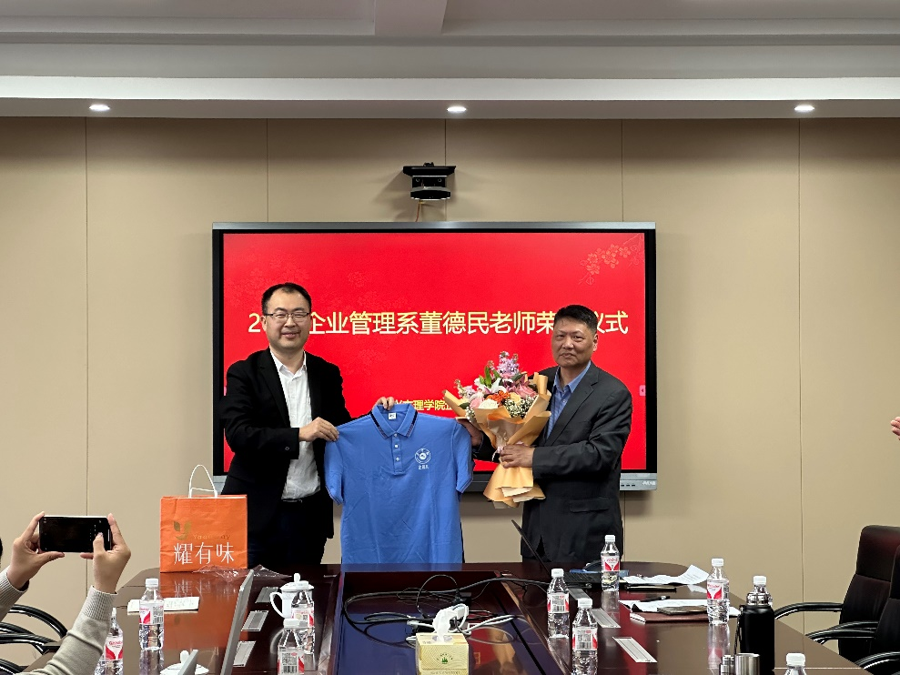 企业管理系全体教师为董德民老师表达了由衷的感谢与衷心的祝福,并由丁志刚副院长代表企管系向董德民老师赠送了鲜花和纪念品,并希望董老师能继续帮助指导企管系青年教师工作,共同推进企管系的高质量发展。