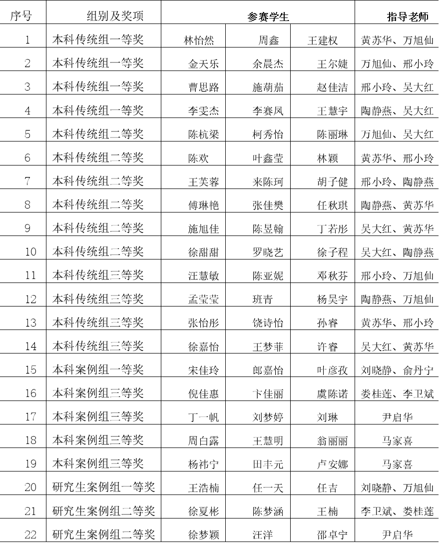我院15支传统组参赛队伍,斩获省一等奖4组、二等奖6组、三等奖4组。本科案例组5支队伍,斩获一等奖1组、三等奖4组;研究生案例组3支队伍,斩获一等奖1组,二等奖2组,其中王浩楠、任一天、任吉获“研究生案例组竞赛之星”称号。具体获奖名单如下: