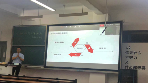 朱经理以银行的逻辑为主题,分别从金融产品创新和当前热点金融问题两方面展开讲座。其中金融产品创新着重介绍其核心要素——客户,同时详细介绍了出口信贷业务及各类信贷产品的理念和现状。朱经理强调了房地产金融产品创新的现实意义,在疫情的大背景下房地产前融是重中之重。银行为房地产业提供资金的筹集、融通、清算等金融服务活动,主要业务模式有:前融、开发贷和按揭贷款。朱经理进一步详细地讲解了绍兴银行明星金融创新产品“优拍贷”,将其设计流程、逻辑、风险规避给予深刻讲解。