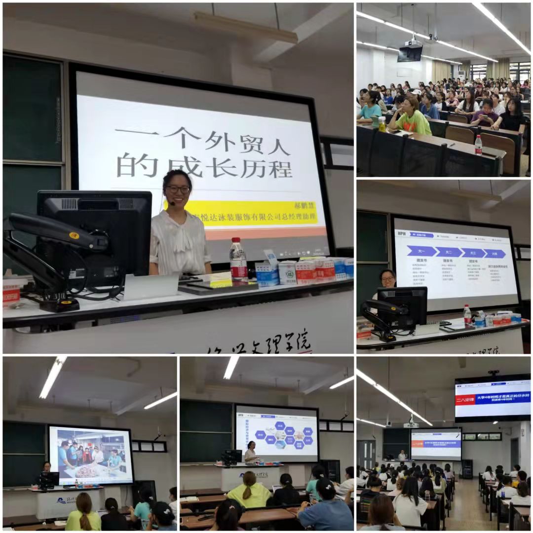 2021年9月28日,绍兴文理学院商学院邀请到2014届优秀毕业绍兴市悦达泳装服饰有限公司总经理助理郝鹏慧女士为国贸和国商专业学生开展了一次引人入胜的业界精英进课堂讲座,讲座的主题是“一个外贸人的成长历程”。