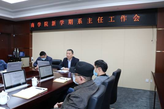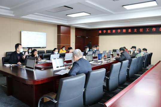 2020年4月15日下午,商学院召开系主任工作会议。周鸿勇院长、喻文莉副院长、丁志刚副院长以及系主任参加会议,参加会议的还有实验中心、教研科和学生科等部门负责人。
