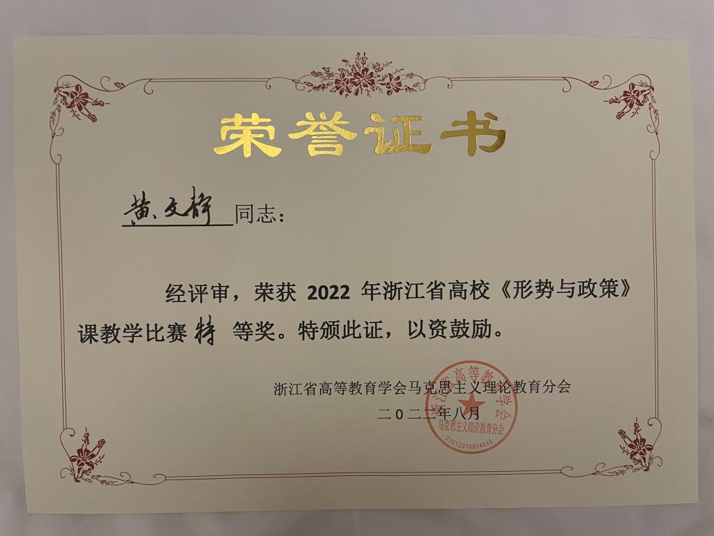 8月24日,由浙江省高等教育学会马克思主义理论教育分会举办的浙江省高校《形势与政策》课教学比赛在台州临海举行。经过激烈角逐,我院黄文静老师荣获特等奖!
